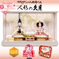 人気のくすみカラーのシンプルなケースで、スッキリとしたデザインが人気です。前飾りは木製のお道具で、菱餅と三方を配置。刺繍のバックがお雛様の雅な雰囲気を引き立てます。