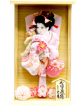 久月の羽子板 「ケース飾り」です。通常の様に置いて飾ることもできますし、壁掛けにすることもできる人気の作品。檜の木目が綺麗なケースは前面の枠が無いパノラマですので横や斜めからみても綺麗に見えます。