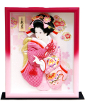 通常の様に置いて飾ることもできますし、お洒落に壁掛けにすることもできる人気の作品。御着物は友禅染めでかのこ絞りの逸品。ケースは鮮やかなグラデーションの枠に刺繍の入った背景を合わせ全体を引き立てます。一年を通して飾りたい作品に仕上がっています。