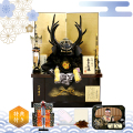 漆黒の鹿角脇立兜が渋みと格好良さがあります。シンプルな金箔二曲屏風(伝統工芸:金沢金箔)に会津塗の高級収納箱の豪華な端午の節句飾り。