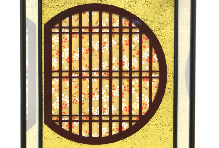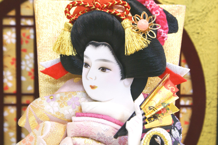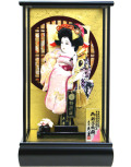久月の羽子板 「ケース飾り」です。ピンクと紺色の優美な御着物が久月らしい作品。背景の格子窓から桜の花を見ているようなデザインです。コンパクトで飾る場所を選びません。8号