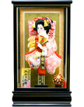 久月の羽子板 「ケース飾り」です。金色のバックに振袖の桜の刺繍が映える作品です。コンパクトで飾る場所を選びません。8号