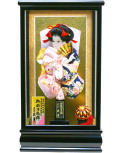 久月の羽子板 「ケース飾り」です。コンパクトで飾る場所を選びません。黒色のケースは背景が金色で高級感があります。桃色と紺色の振袖に金彩の刺繍が華やかな作品。8号