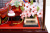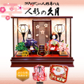 久月作の雛人形 親王ケース飾りです。間口38cmとコンパクトで飾る場所や収納場所を取りません。ワインレッドのケースにバックの桜が映えます。小芥子
