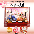 久月作の雛人形 親王ケース飾りです。六角形のケースは斜めからもお人形さんがよく見えます。ケース枠は落ち着いた朱色で、背景の紅白梅や前飾りとマッチしています。芥子