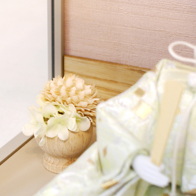 人気のくすみカラーのケース枠。屏風はLEDで艶やかさを演出。丁寧に造られた木彫り幾何学模様も高級感があります。お花のもそれに合わせたトーンを抑えた作りで、洋室にも合うおしゃれな作品です。