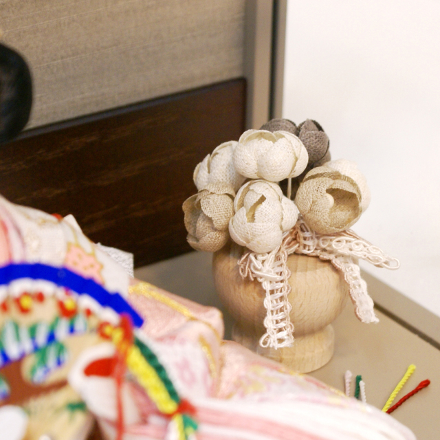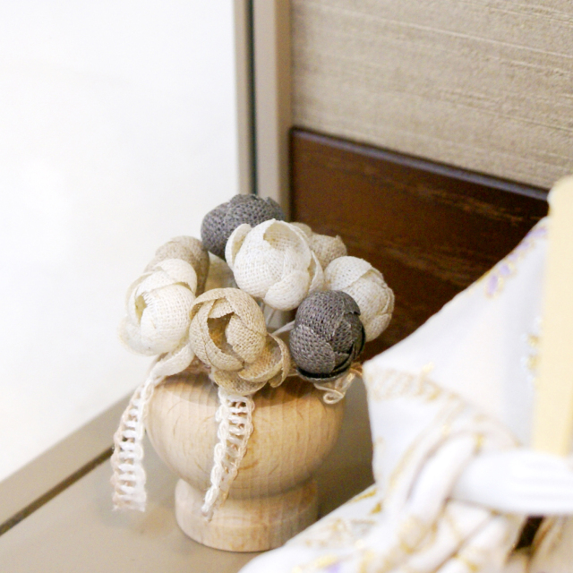人気のくすみカラーのケース枠。屏風はLEDで艶やかさを演出。丁寧に造られた木彫り幾何学模様も高級感があります。お花のもそれに合わせたトーンを抑えた作りで、洋室にも合うおしゃれな作品です。
