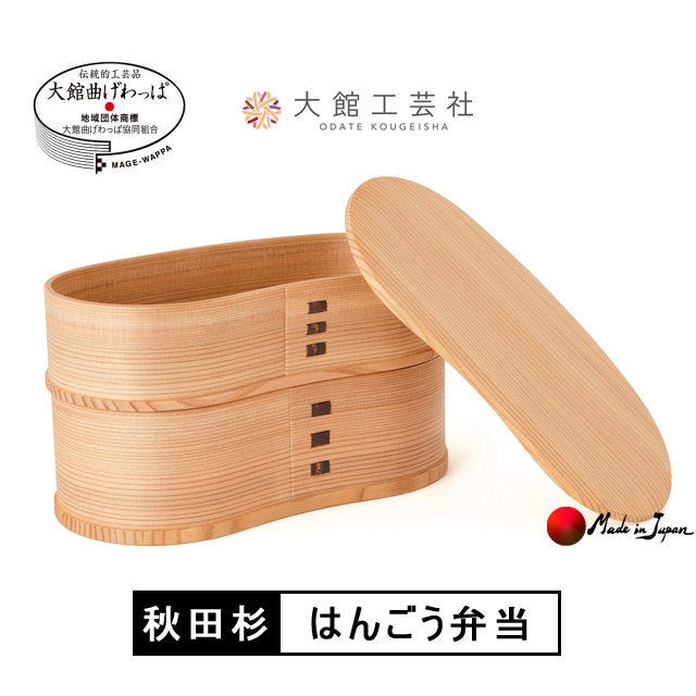 商品説明: はんごう形で2段になった曲げわっぱのお弁当箱の「はんごう弁当 2530」 近年では、海外でも人気のある「曲げわっぱ」。 木の美しさと和の温もりが心豊かに伝わり、日本三大美林のひとつに数えられる秋田杉の均一で美しい木目を活かした国指定の伝統的工芸品。 明るく優雅な風合いと、軽量でありながら強度と弾力性に富んだ郷の逸品です。