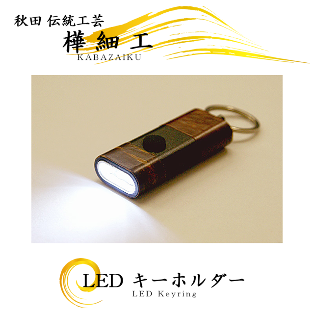 商品説明: 秋田の伝統工芸「樺細工」で造られたLEDキーホルダー。山桜の皮をなめして造られる秋田古来の伝統技法の樺細工。現代のアイテムに伝統工芸を施した粋な作品です。