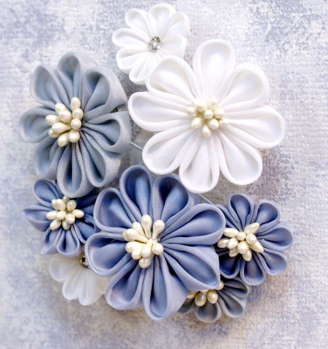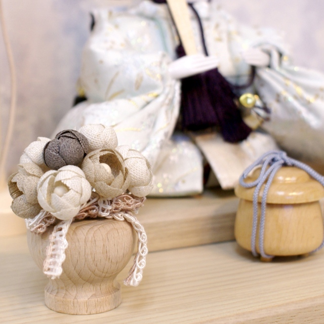 人気のくすみカラーでまとめた作品です。くすみブルーでまとめた収納箱には、ちりめんでフラワーアレンジメントが飾られています。お花やお道具も落ち着いたトーンで合わせてあります。