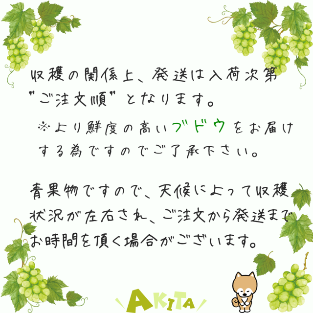 商品説明: ◆商品名:秋田県産ぶどう「シャインマスカット」JA秋田ふるさと JA秋田おばこ ◆商品内容:700g×2房 JA(産地)は指定できません。 ◆発送:クール便 ※収穫の関係上、入荷次第順次発送となります。 ◆出荷期間:9月中旬~10月下旬を予定 ◆化粧箱外寸:幅34×奥行25×高さ14cm